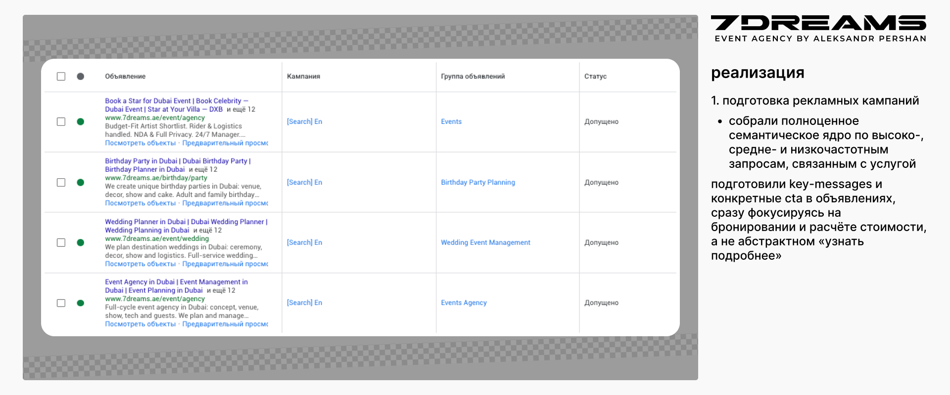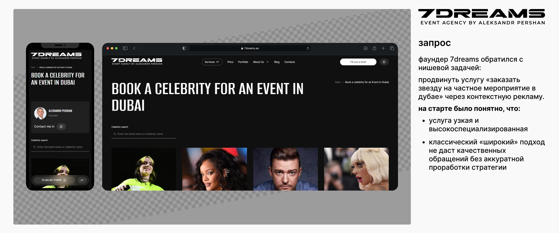 The founder of 7dreams approached us with a niche task: to promote the service «book a celebrity for a private event in Dubai» through contextual advertising.