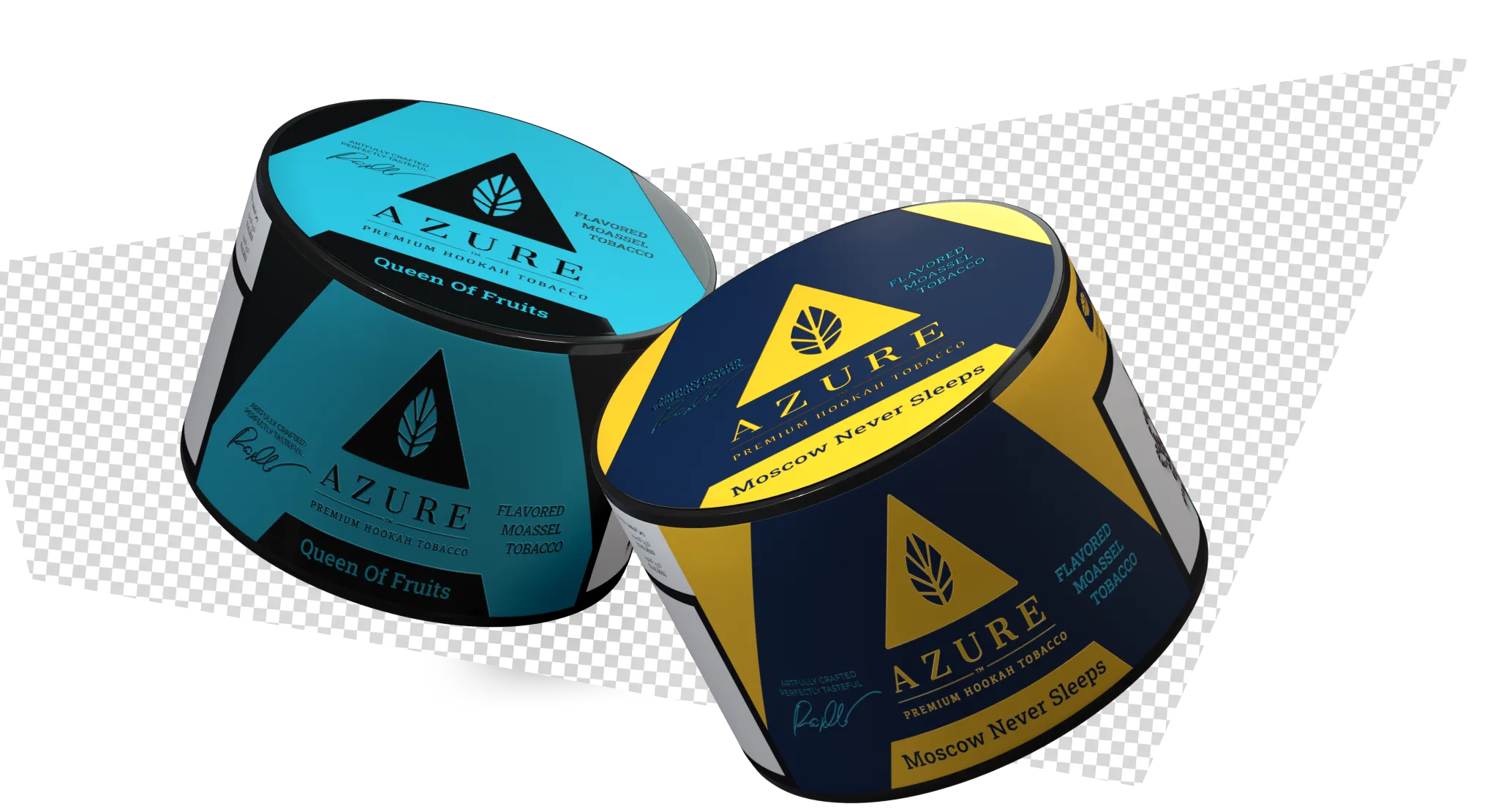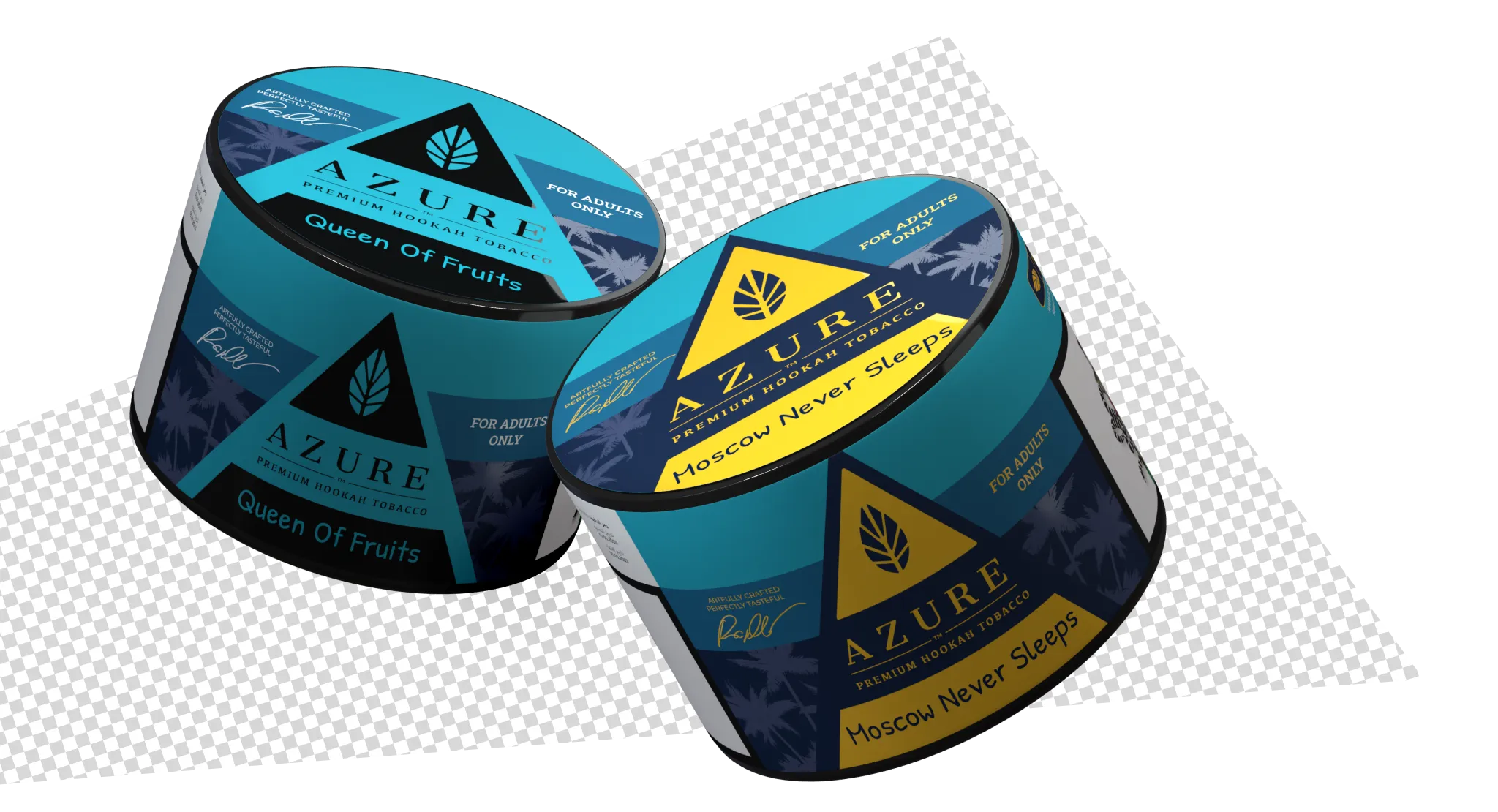 Azure traditionally produces hookah tobacco in a laminated pouch format. Our task was to adapt the brand to a new plastic jar format while preserving its recognizability and premium character. We developed three concepts and selected a signature classic direction based on strong geometry and clear color coding.